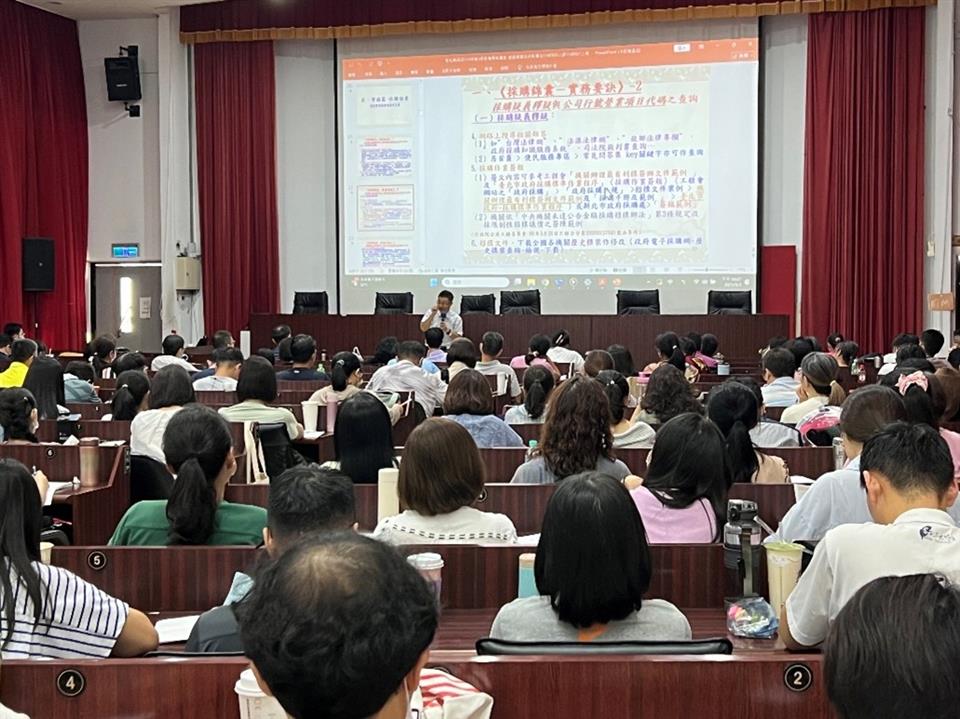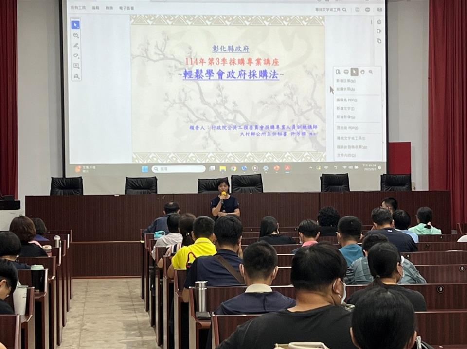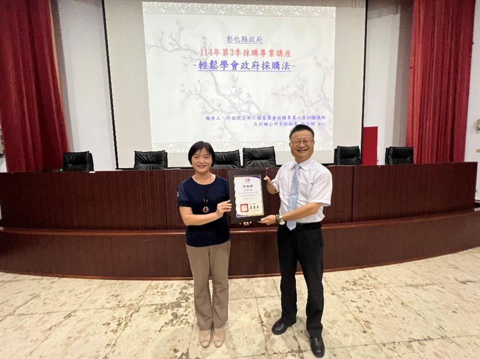 新聞焦點 彰化縣政府114年採購業務講習(第3場)圓滿落幕 發布日期 2025/09/05~2025/10/05 | 發佈單位: 行政處採購科 | 發佈日期: 蕭辦事員 分機1046 | 更新日期 2025/09/05 | 瀏覽人數: 32人 本府採購業務講習(第3場)已於114年9月3日圓滿完成,來自本縣各機關及學校共163位同仁踴躍參與,現場氣氛熱絡,反應熱烈。本次講習特別邀請本縣大村鄉公所主任秘書許芳榤擔任講師,主題為「輕鬆學會政府採購法」,課程內容統整了採購法常用條文及相關觀念,教導如何善用採購工具面對採購問題,並透過案例分享,使與會人員對採購法規與實務有更全面且深入的認識。本次活動開場由本府行政處處長吳蘭梅蒞臨致詞,並代表縣府團隊頒發感謝狀予許主任秘書,以表達對其專業分享的誠摯感謝,肯定其對本縣採購業務精進所做出的貢獻。透過本次講習,參訓同仁對採購法令、相關作業流程有了更清晰的掌握,辦理採購案件時亦能更切合法規,獲益良多。
