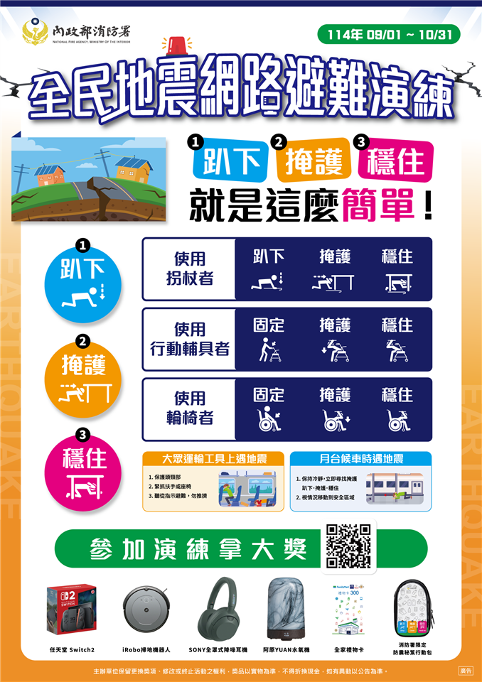 新聞焦點 114年彰化縣國家防災日全民地震避難演練暨防災宣導活動 發布日期 2025/09/26~2025/10/26 | 發佈單位: 行政處庶務科 | 發佈日期: 粘志遠 7531066 | 更新日期 2025/09/26 | 瀏覽人數: 29人 《置頂》 本府為提升同仁地震災害應變能力,配合「114年彰化縣國家防災日全民地震避難演練暨防災宣導活動執行計畫」,於9月19日上午9時21分於縣府辦公大樓辦理「全民地震網路避難動作演練」。演練內容依循地震避難3步驟(趴下Drop【固定Lock】、掩護Cover、穩住Hold),期望透過實地演練發揮早期預警功能,以強化地震防災應變能力。 同時,為擴大防災宣導效益,本府亦積極鼓勵同仁可至內政部消防署「消防防災館」網站查閱並下載「消防防災e點通APP」,運用其災害示警推播、防災準備、避難處所查詢等個人化功能,並參加全民防災知識模擬考,透過情境式互動測驗,建立正確防災觀念,更多活動相關訊息,可至內政部消防署「消防防災館」網站(https://www.tfdp.com.tw/cht/index.php)查詢。