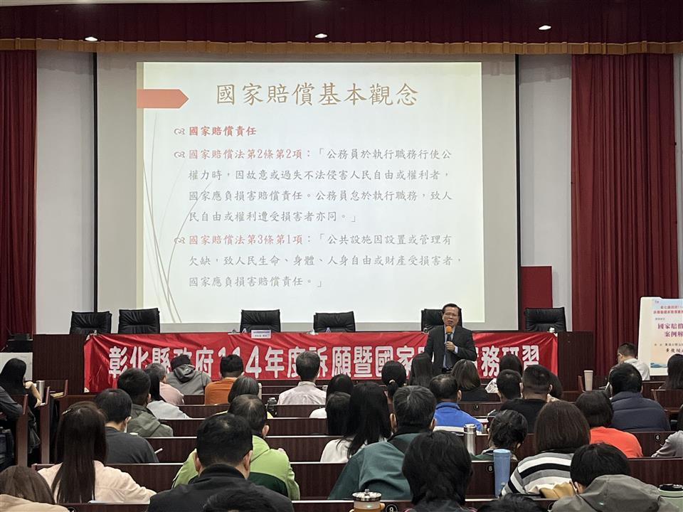 新聞焦點 彰化縣政府舉辦114年度訴願及國家賠償實務研習 提升行政法實務能力 發布日期 2025/12/04~2026/01/04 | 發佈單位: 行政處訴願科 | 發佈日期: 許小姐 7531767 | 更新日期 2025/12/04 | 瀏覽人數: 25人 彰化縣政府於12月3日在縣府第二辦公大樓9樓舉辦「114年度訴願及國家賠償實務研習」,邀請東海大學黃啟禎教授與中興大學李惠宗教授,針對國家賠償與訴願等課題進行深入探討。此次研習會吸引來自本府及所屬機關學校、公所等約160位同仁參與,共同提升在行政法領域的實務能力。 縣府行政處長吳蘭梅代表縣長出席並致詞,對學員們的參與表達高度的肯定與鼓勵。本次研習不僅是對行政實務能力的強化,更有助於提升政府機關的法制運作與透明度。相信學員們今天所學知識對日後工作有很大助力,也將促進整體行政效能的提升。 本次研習黃啟禎教授講授「國家賠償案例解析」,黃教授現任東海大學法學院教授,並擁有德國慕尼黑大學法學博士學位,在講座中深入分析「國家賠償案例」,以具體案例解析方式,幫助學員理解國家賠償的法律原則與實務操作,並分享相關的司法判決與實務經驗。李惠宗教授則講授「訴願與行政訴訟案例解析」,李教授現任中興大學法學院教授,同樣擁有德國慕尼黑大學法學博士學位,則針對「訴願與行政訴訟案例解析」進行講解,介紹訴願程序的基本規定,並透過多個案例分析,闡述行政訴訟與訴願在實務中的操作與應用,為學員提供實用的法律知識與應對策略。 此次研習活動不僅加深學員對訴願與國家賠償相關規定的理解,還進一步加強行政機關在處理法律爭議中的專業能力,對彰化縣政府提升依法行政的水準具有重要意義。