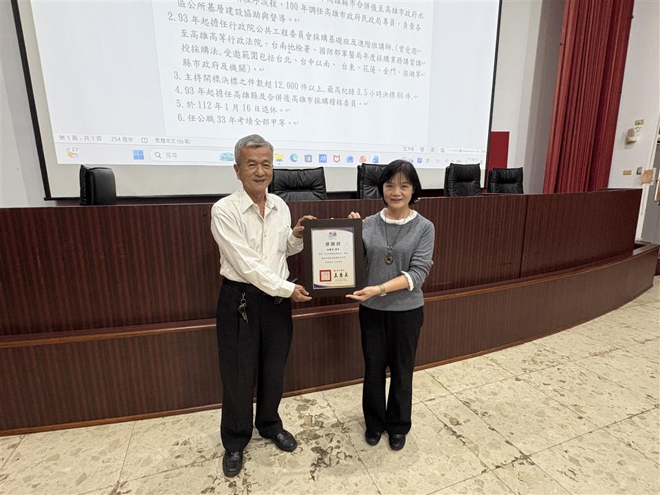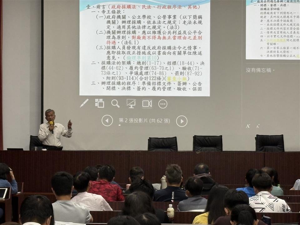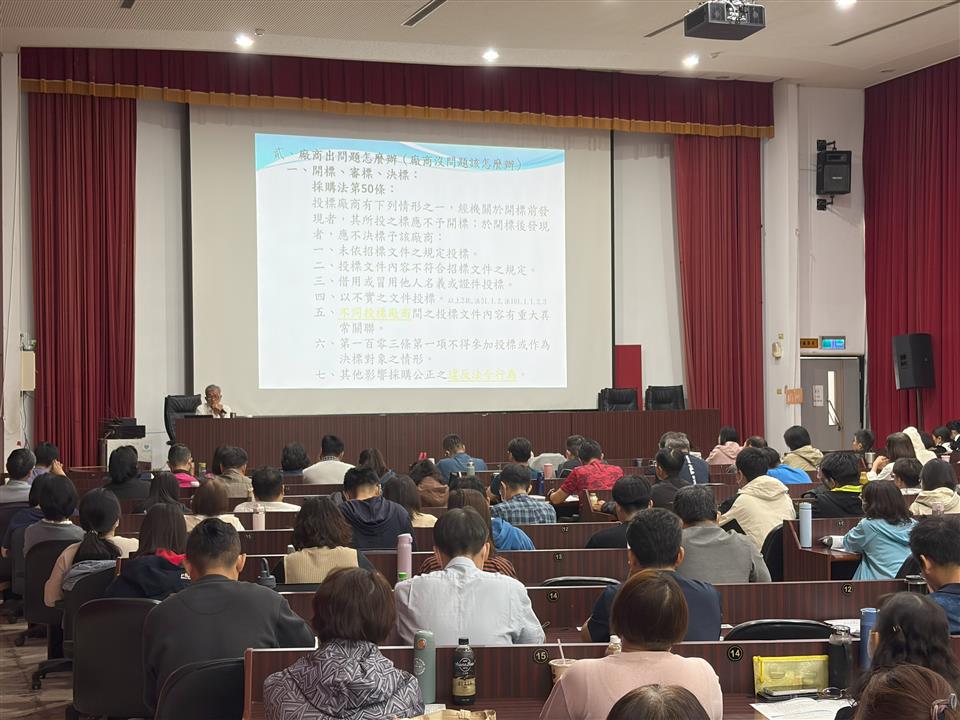 新聞焦點 彰化縣政府115年採購業務講習(第1場)圓滿完成 發布日期 2026/03/30~2026/04/30 | 發佈單位: 行政處採購科 | 發佈日期: 蕭辦事員 分機1046 | 更新日期 2026/03/30 | 瀏覽人數: 17人 本府採購業務講習(第1場)已於115年3月27日圓滿完成,來自本縣各機關及學校共165位同仁踴躍參與,現場互動熱絡,迴響熱烈。本次講習特別邀請採購法專業講師林慶堂老師擔任主講者,以「廠商出問題怎麼辦?拒絕往來公告流程一次掌握」為主題,講解政府採購法規與實務,內容涵蓋採購程序與規定、審標決標作業、押標金不予發還及追繳規定、以及廠商停權等重點議題,並輔以案例分享,協助與會人員提升採購法規之理解與應用能力。活動開場由本府行政處處長吳蘭梅蒞臨致詞,並代表縣府頒發感謝狀予林老師,感謝其擔任講師協助精進本縣採購業務。本次講習在林老師的專業講解下,讓參訓同仁對採購相關法令及作業流程有了更清楚的理解,收獲良多。